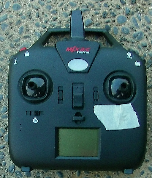 The masking tape that you see on the radio is there to cover up the Headless Mode switch, which was the primary reason that the drone got "treed" the same day that I received it.