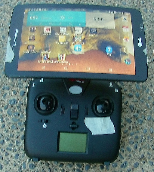 Photograph of its remote control with my own tablet computer affixed to it.