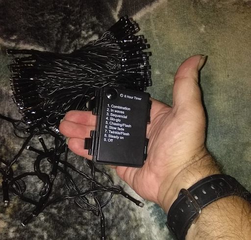 The light sets contain 200 multicolor (50 ea. phosphor red, phosphor yellow, phosphor green, and native blue) 3mm inverse conical lens LEDs, powered by three AA cells inside a surprisingly well-constructed battery pack.