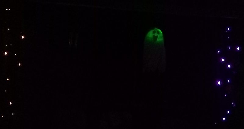 Photograph of the lights deployed on our porch as they will be for Halloween.