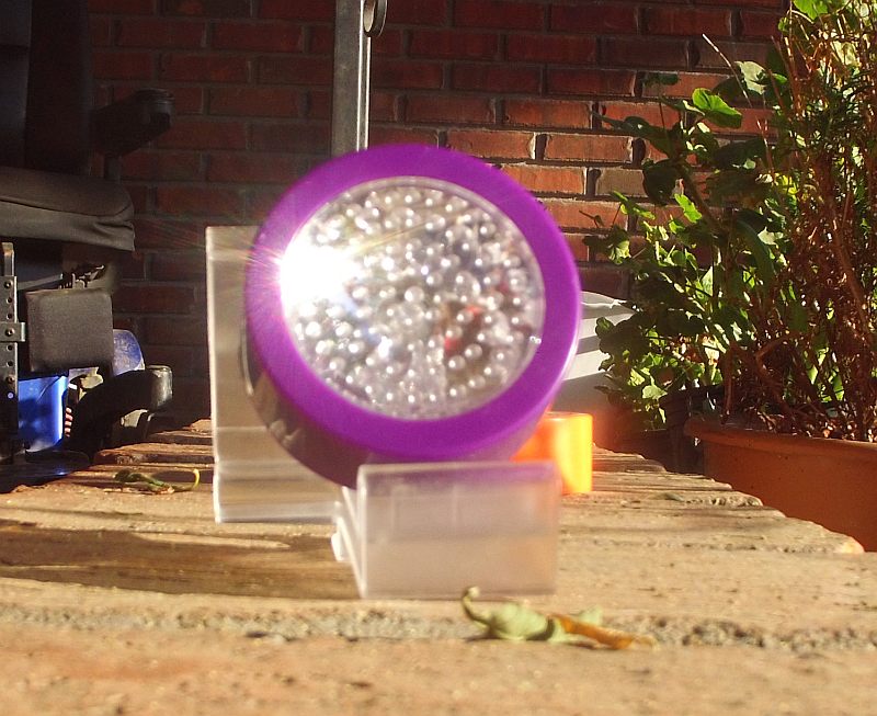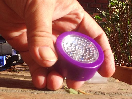 It is a flat, circular (puck-shaped) device that has a surprisingly potent 5mm RGB (Red/Green/Blue) LED in it.