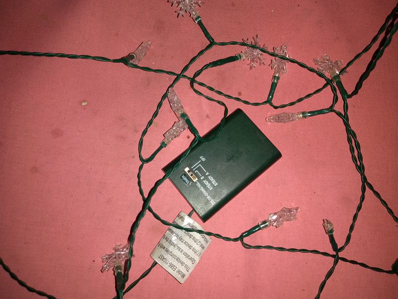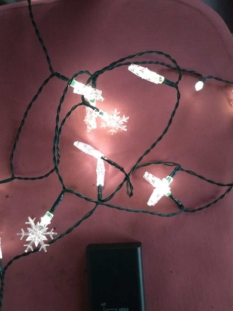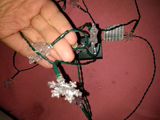 The light set uses three AA cells; decorate with them as you would ordinary corded Christmas light sets.