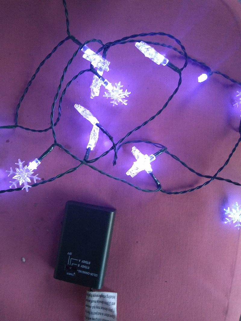 This is a set of 20 color-changing (color-shifting actually) "snowflake-shaped" LED Christmas lights. Each "snowflake" has a BW (blue/white) (or seperate white and blue LEDs) inside; these all do a color fade routine in unison (together) when the switch is turned on -- or you can have them steady-on in white or blue if the color-shifting business piddles you off.