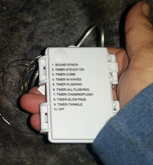 The light sets contain 50 multicolor (10 ea. phosphor red, phosphor yellow, phosphor green, phosphor purple, and native blue) "blob-type" LEDs, powered by three AA cells inside a surprisingly well-constructed battery pack.