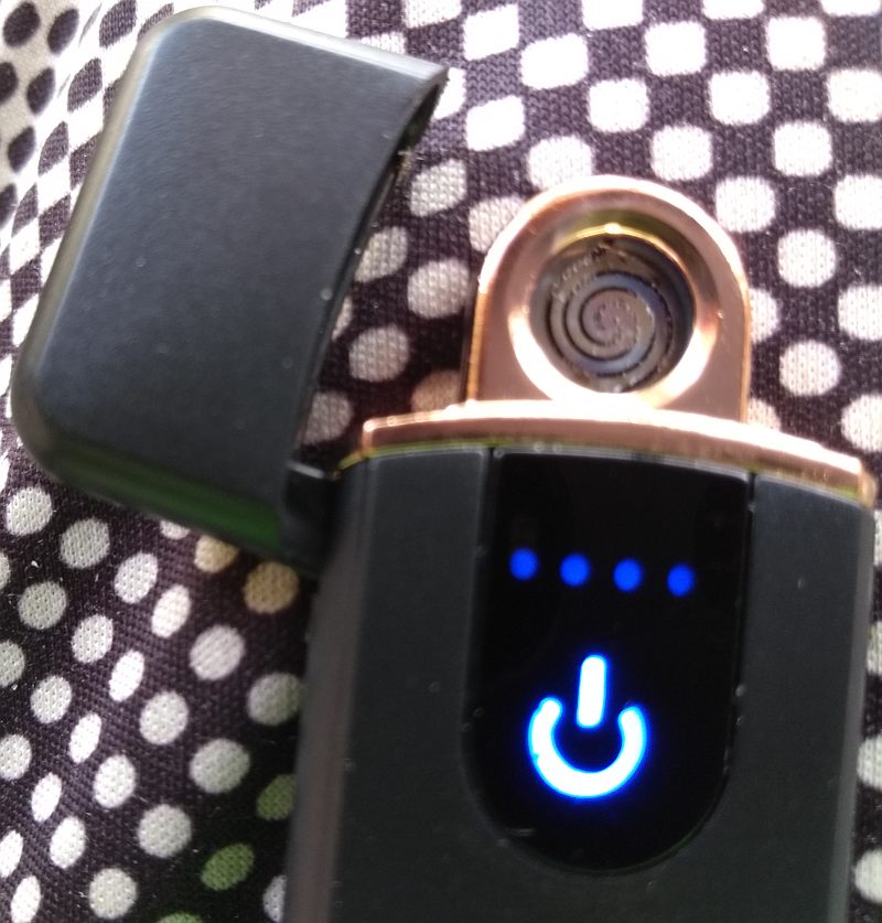 It uses a heated, glowing coil to accomplish this task, and plugs into a USB port on your computer to recharge its internal battery.