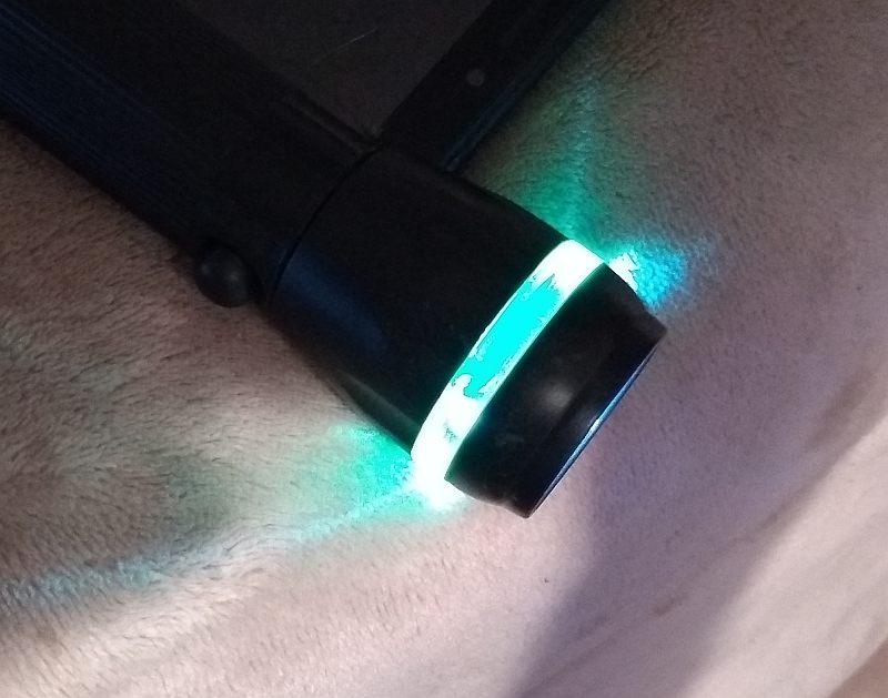 There is a green plastic ring on the bezel which glows when the flashlight is in use. Although many users will not mind it, some users of this flashlight might find this glow objectionable.