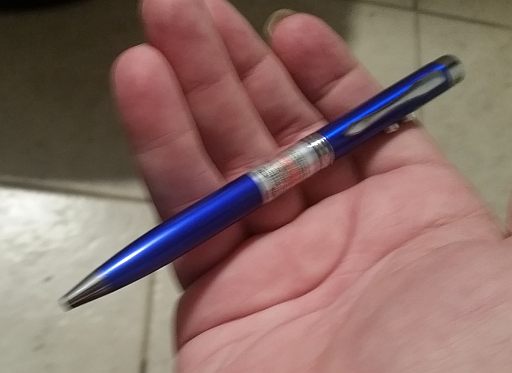 The device runs on three LR-41 button cells, contained inside the upper part of the pen. It comes in a handsome two-tone metal case, which has a slightly shiny blue finish with chrome accents.