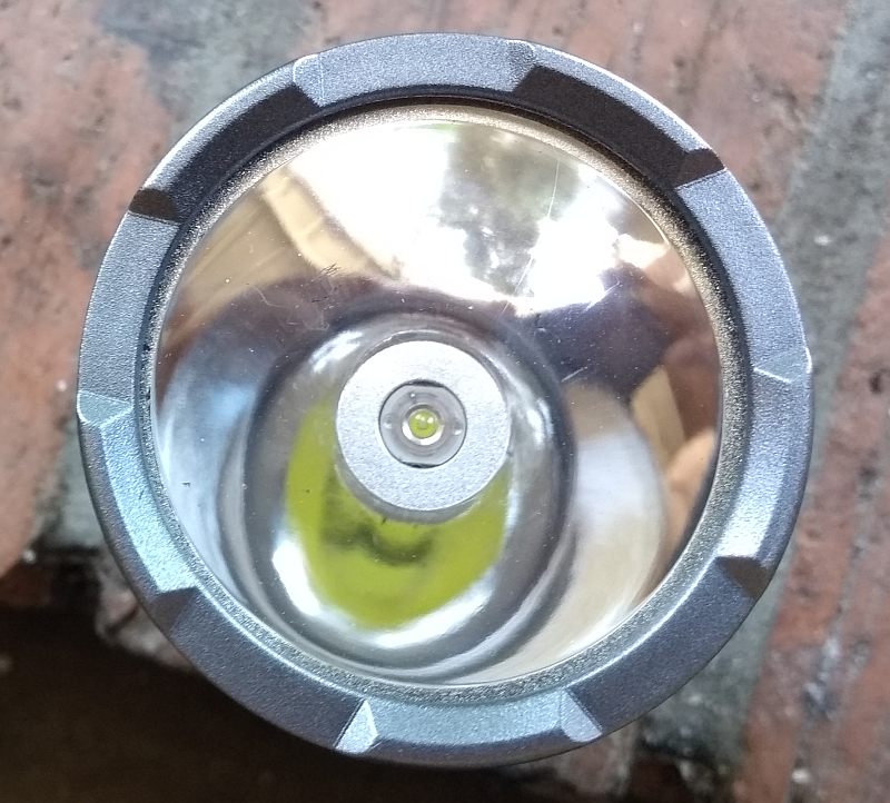 The P100 LED + COB Rechargeable Flashlight (hereinafter, probably referred to as a "flashlight" on this web page) is a blindingly bright LED flashlight that has a twist: in addition to the phosphor white LED where you would expect to find it (near the bottom of a reflector), it has an additional phosphor white COB (Chip On Board) LED on the side of the barrel that enables you to use this flashlight as an area light. This LED has 14 dice (light-emitting regions).