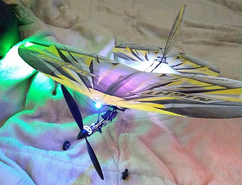 The E-Flite UMX Night Vapor R/C Airplane (hereinafter, probably just called the Night Vapor) is a small, slow-flying R/C airplane. It isn't designed to be a speed demon; no, it is actually designed specifically to be a very slow flyer. This also means that the Night Vapor can be flown indoors -- in fact, it was spefically designed to be flown indoors -- though you can fly it outside IN CALM WIND CONDITIONS ONLY!!!