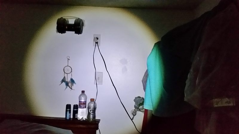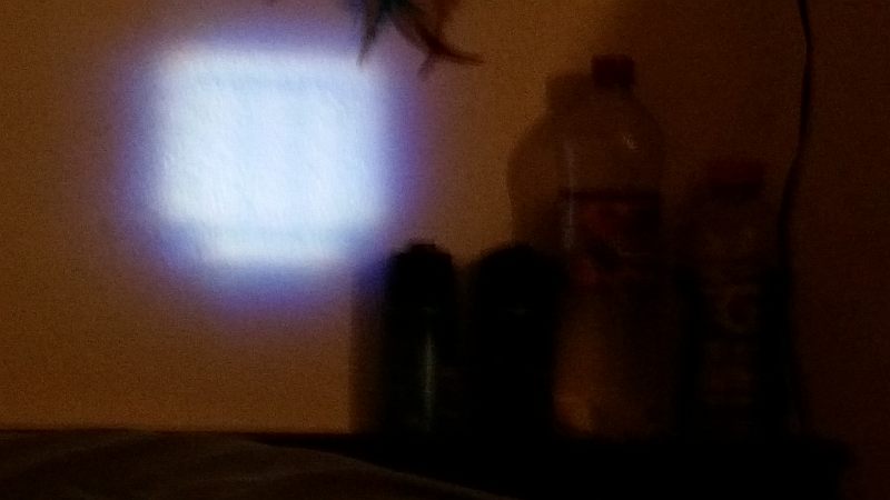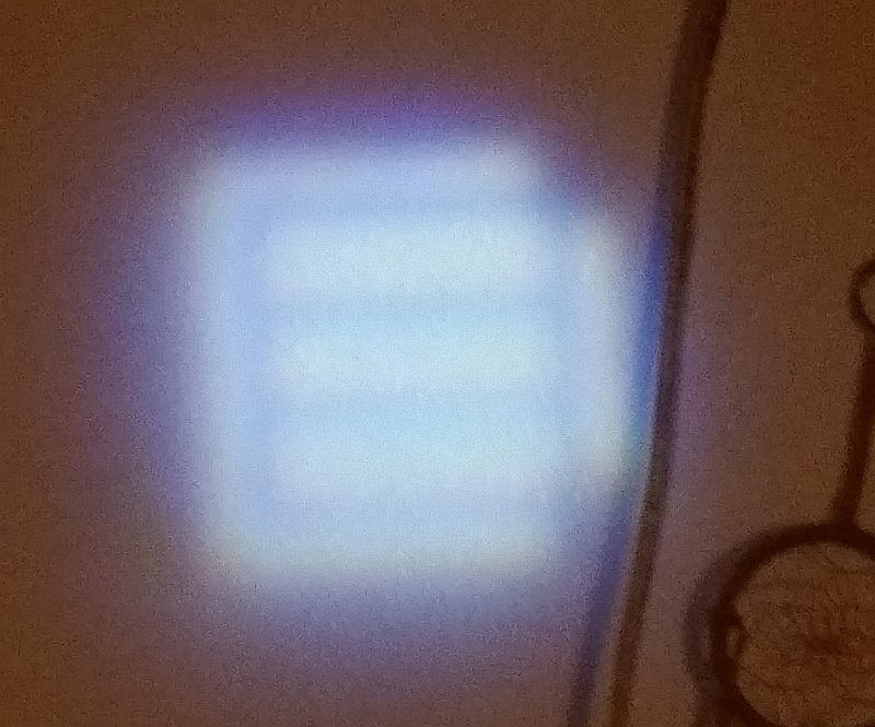 Beam terminus photograph on a wall at ~8 feet (narrow focus and zoomed to show beam details; as you can see, this is a magnified image of the LED's die {light-emitting region}).