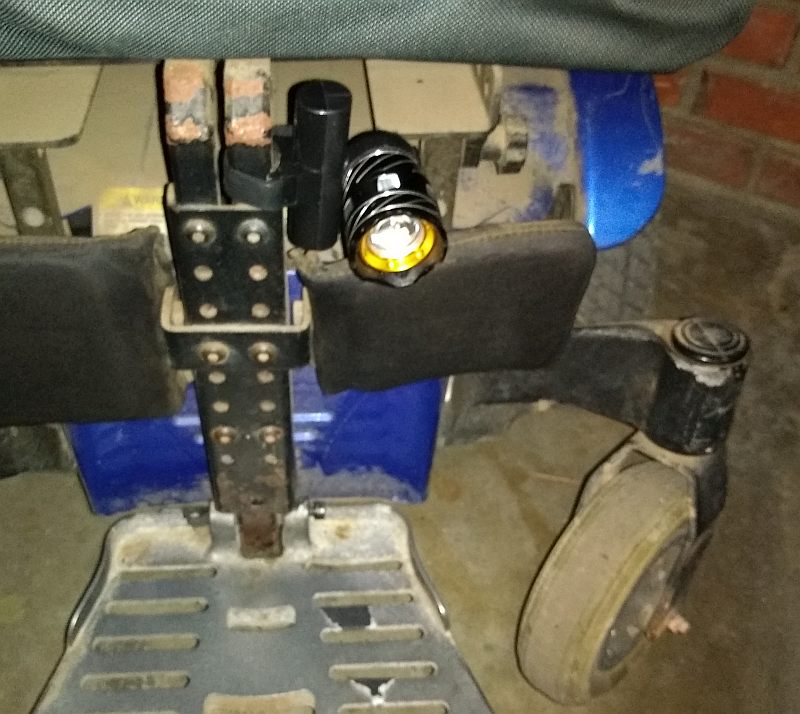 Since I don't have a bicycle, I show how I affixed it to the front of my electric wheelchair for those pesky night missions.