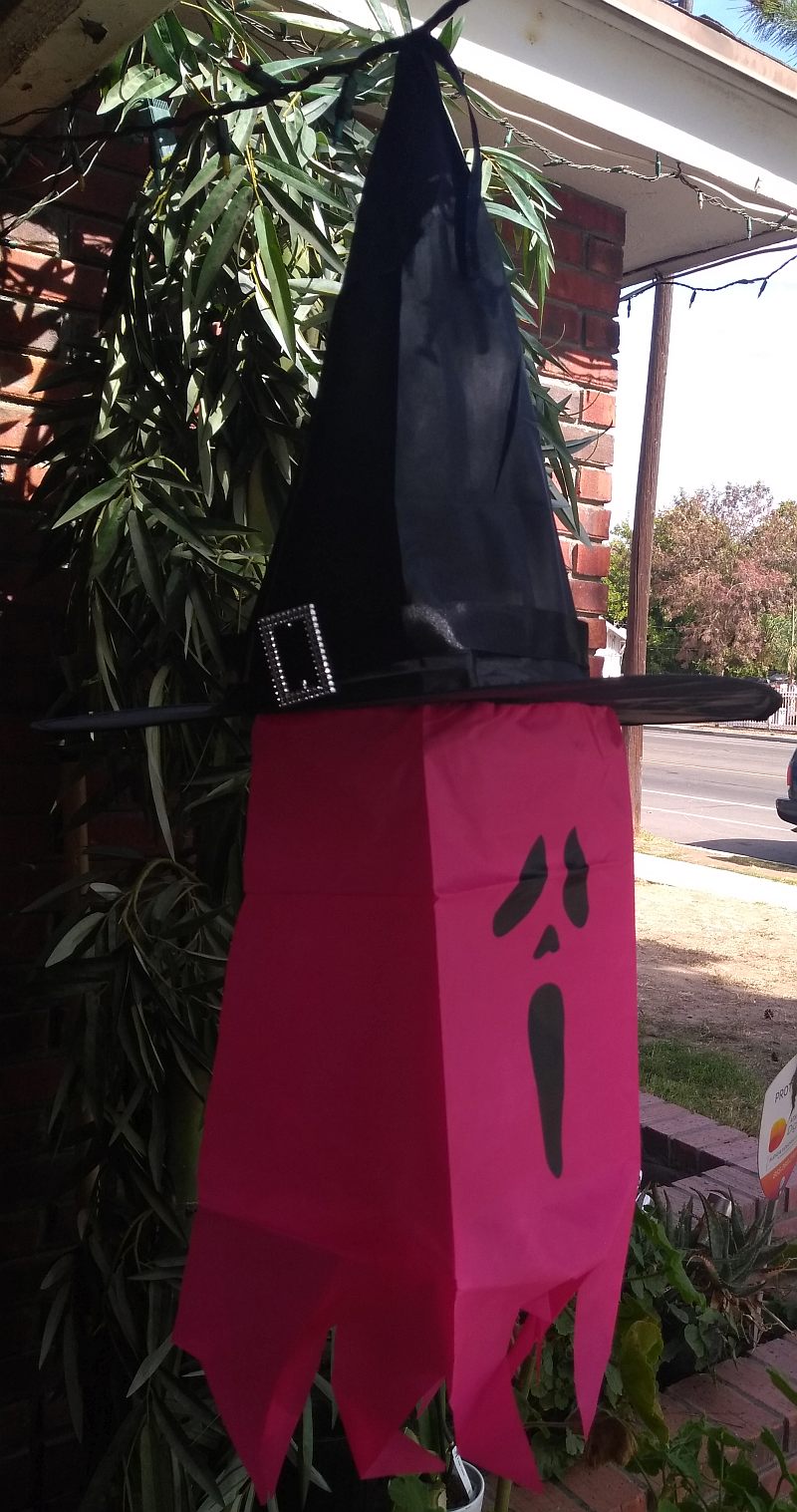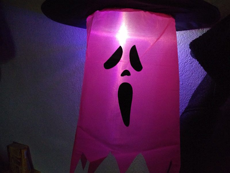 The Lighted Halloween Witch Hat Decoration (hereinafter probably just called the Witch Hat) is a Halloween decoration designed to be hung on your porch (or indoors if you're decorating for an indoor Halloween party). It is made primarily of fabric; it is designed to look like a stereotypical "witch's hat" with a pink "ghost" dangling from its underside.