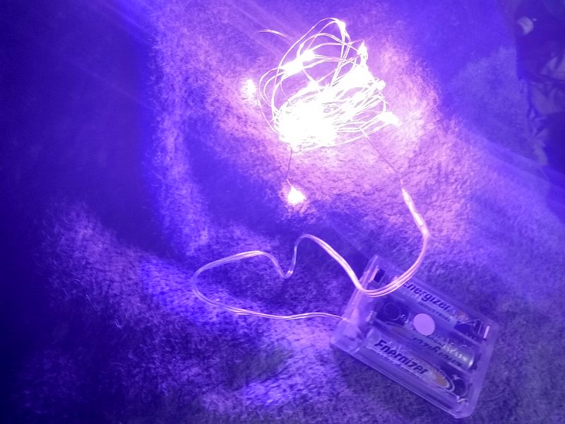 This light set has 30 "dewdrop" phosphor pink, operates from three (3) AA cells, and has silvery-colored wire.