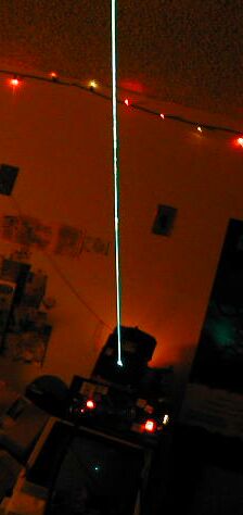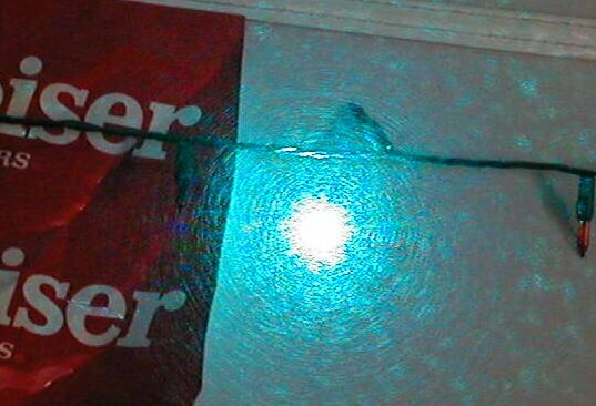 Here is a picture of the laser's beam. It outputs 16mW CW (continuous wave) at 488nm; a striking shade of turquoise blue. It operates at TEM00 (Transverse Electromagnetic Mode 00) This simply means it produces a round beam with a gaussian power distribution. I don't know what the beam divergence is, but it appears to be under 2 Mrad (Milliradians). It also eclipses the 6.8mW helium-neon you see on my Melles Griot HeNe Laser Head web page as the most powerful gas laser in my arsenal.
