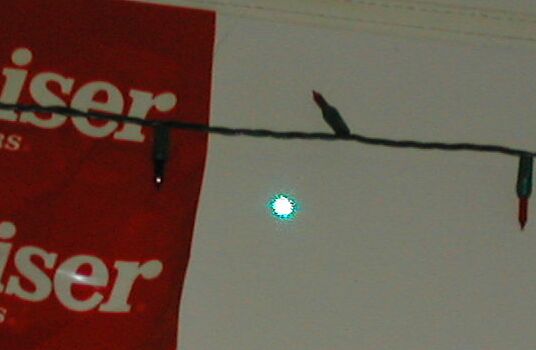 Here's the spot on the wall from about 20 feet away. There *are* some artifacts outside the main beam, but not nearly as bad as the camera made them look. By far, most of the ringyness and artifacts you see in this picture are added by the camera, and do not appear in real life. In reality, the blue spot on the wall has a very neat, clean look to it.
