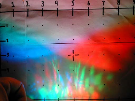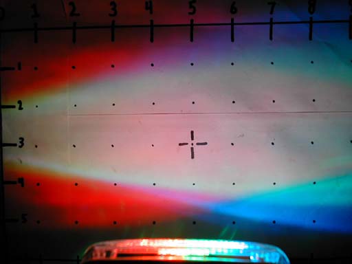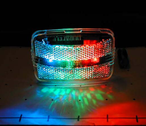 Closer shot showing the wonderful colors at the edges, while the center mixes nicely to a quite usable white. Yes, you can take this off your bike and use it as a flashlight if need be! Try that with an ordinary blinking red LED bike light!