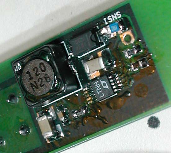 Here is a close-up of the working part of the circuit board. This is a DC-DC inverter, which boosts the 3v from the batteries to as much as the string of LEDs need, up to 25 volts. For this particular configuration of six emitters in mixed chemistries, that figure is closer to 17.5 or 18 volts. What this allows is for the LEDs to be connected in series - and more importantly - it allows you to "mix & match" LEDs of differing voltage requirements. That means you can mix red and blue, turquoise and amber, or just do the whole rainbow. You can't do this with an ordinary parallel configuration that's used in most other multi-LED lights. With this series configuration, every LED gets 30 milliamps, regardless of its Vf rating.