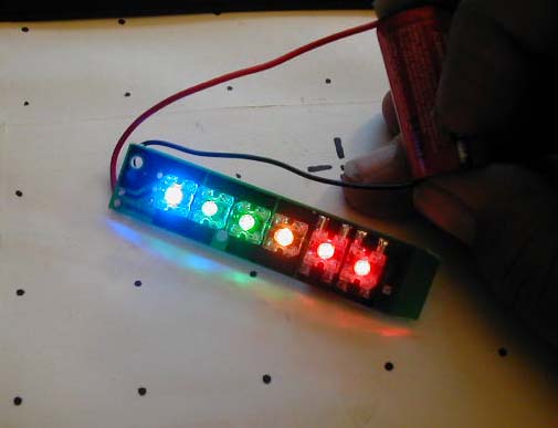 However, I was also provided with a fully-populated and ready-to-connect circuit board for this modification, also outfitted with the rainbow LED "variety pack". It has six high-flux ("spider") LEDs arranged in a rainbow: red, reddish orange, yellow, green, blue-green, and blue.