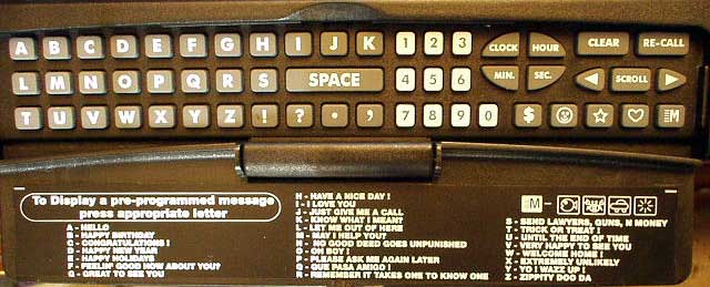 To display any of the canned messages, turn the Mode Select switch to the center position (Message). Open the hinged keyboard cover, and choose a message from the many that are shown on the lid, and press the corresponding letter on the keyboard. That message will instantly come on and scroll right to left.