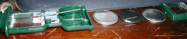 Insert one new CR2016 cell in the battery tray, flat (+) positive side down. Lay the black plastic disc on top of that; orient it so the resistor fits the cutout in the side of the battery tray for it. Put the other cell on top of the disc, flat (+) side down. Be sure the LED lead goes OVER this cell, not under it.