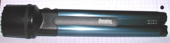 This shot shows how the batteries load into the unit. In this picture, the flashlight is lying on its side with the Energizer logo showing upside-down, and the switch button facing you.