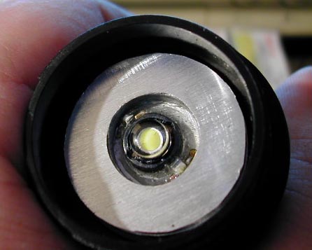 This is a closeup of the modification itself. A Luxeon Star LED is mounted on an aluminum slug in a precise location in the center (relative to the flashlight's reflector); surrounded by a second thick aluminum disc that serves both as an alignment platform