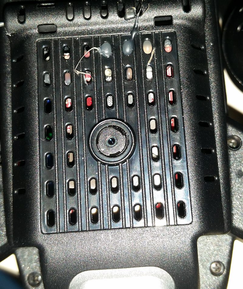 Photograph of the underside of the drone, specfically so that you can see the camera for the optical flow positioning system.