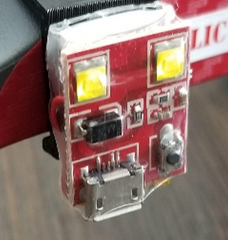 So I plugged it into the charger after returning home and nothing happened -- that is, the red LED failed to turn on. But after fv¢k¡ñg with it for several minutes, I got the red light to come on. But it only stayed on for ~ten minutes and then the green light came on. So I unplugged it and then plugged it up again -- much as I expected, the red LED came on. After repeating this action several times, I just said the hell with it and put the drone (with this light affixed to its fuselage) back in its case.