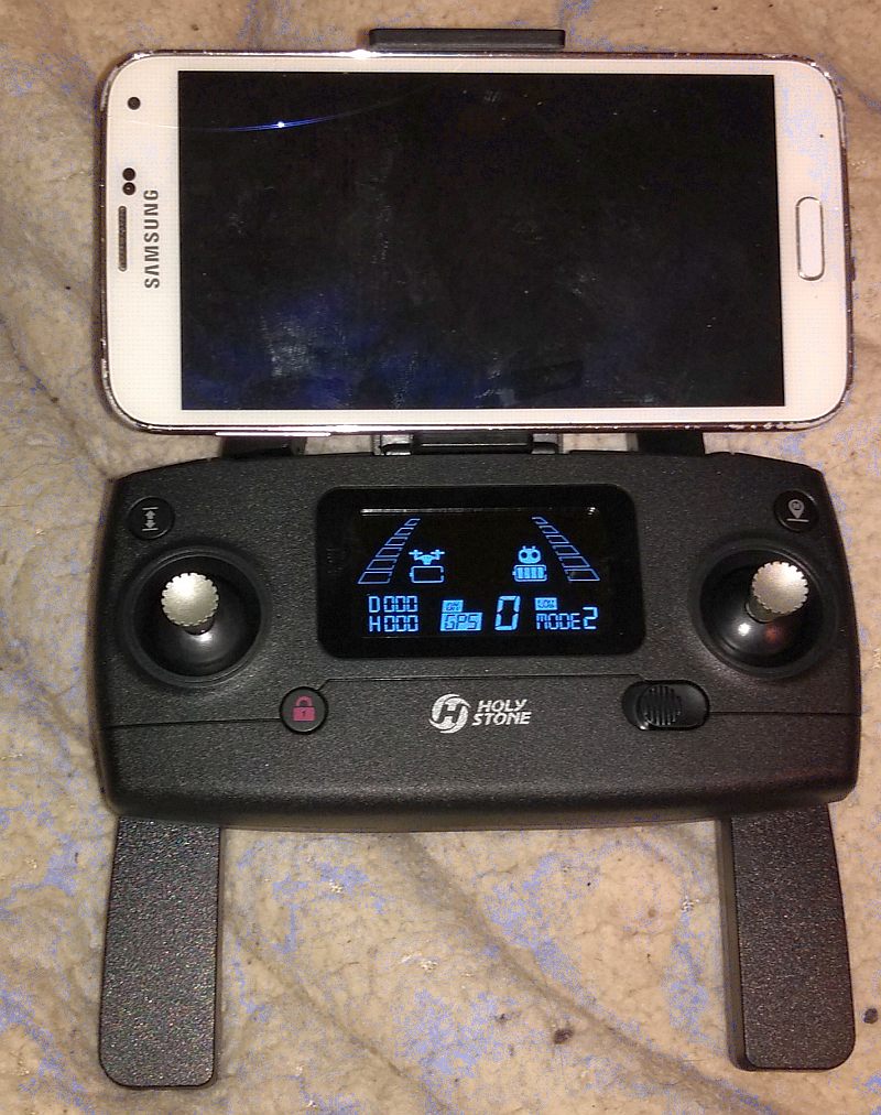 Photograph of the radio (transmitter) for this drone with a cellular telephone handset clipped into place.