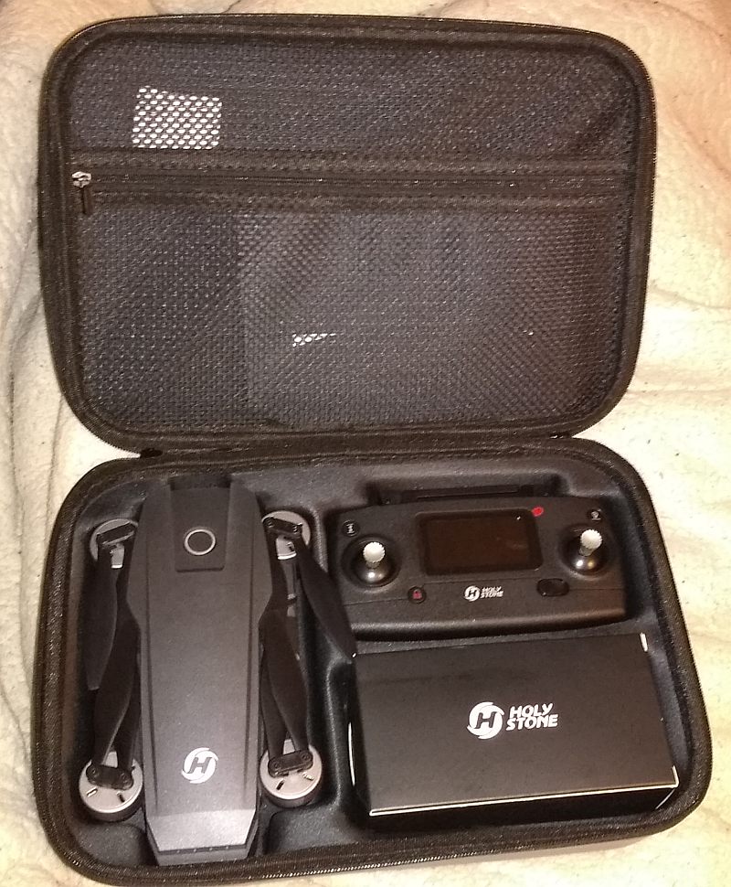I just love the living tweedle out of the carrying case! Everything (and I do mean ***EVERYTHING***) that the HS720E comes with fits neatly into cutouts in the fabric-covered substance (unknown, though probably very heavy cardboard) for them (and a noncloseable pocket on the inside of the bag -- which is great if you wish to bring along extra flight batteries): the drone itself, the transmitter, all spare props, a second flight battery, and the charger & its cord).