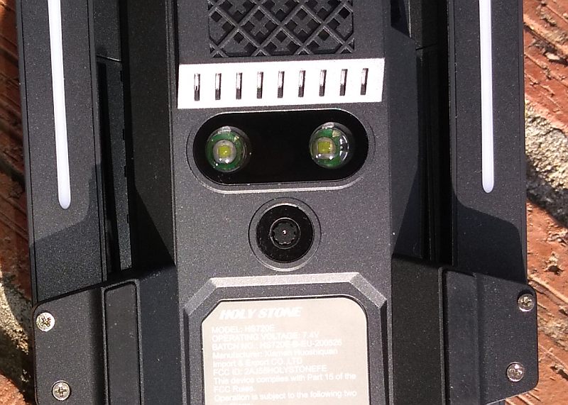 The Holy Stone HS720E Brushless 4K Drone (hereinafter, probably just called the HS720E) is a mid-sized (360mm L x 330mm W x 70mm T), surprisingly light (490g {17.280 oz.}) drone that features GPS stabilisation, EIS (Electromic Image Stabilisation), a rechargeable 2S (two cell) 2,800mAh Li:Po (lithium polymer) flight battery, and the ability to tilt the camera's lens over a 110° range -- from pointing forward and slightly up to pointing straight down.