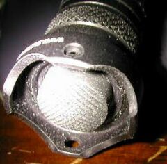 I'm not much of a fighter, so the crenelated (scalloped) bezel and tailcap will be of limited usefulness here. But if you were in a dark alley and you weren't alone, you could grasp the E2D in your fist, so that the tailcap protrudes where your pinkie finger is, and the bezel protrudes where your thumb and forefinger are (or vice versa), and strike your opponent with the bezel or tailcap. Be sure to strike your opponent where it hurts most, such as in the face or in the groin. Well, striking someone in the {vulgar term for testicles} with this flashlight or any other device is probably a no-no, but you get the idea.