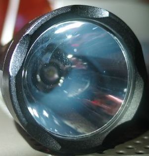 Picture of the business-end of the clone U2, showing the LED emitter, the smooth reflector, and the lightly scalloped bezel.