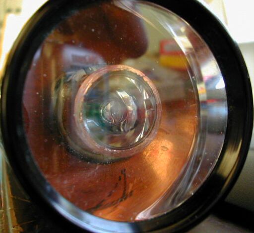 The Elektrolumens 5W cyan LS LED is surrounded by what appears to be a short length of copper tubing or pipe, and what appears to be a NX01 Luxeon Star optic is set into the end of it. The copper tubing probably helps to heatsink the LED and it holds the optic in place, so you should not try to remove it.
