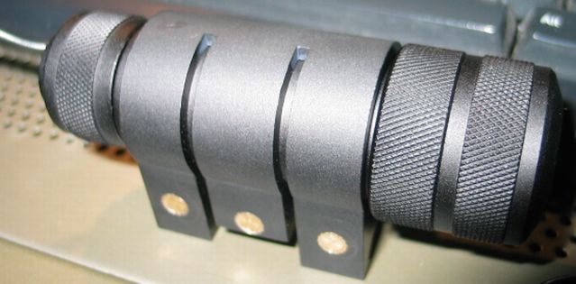This is a red laser aiming device that attaches to a handgun. Because it uses a directly-injected red laser diode, it should withstand a gun's recoil ("kick") better than most DPSS (yellow, green, or blue) laser aimers would.