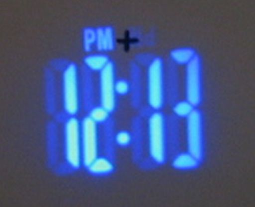 Photograph of the time (12:13pm) projected onto the test target with a blue LED display at ~12 inches.