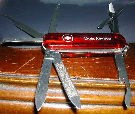 This model has scissors, tweezers, pen knife blade, file, jeweler's/optical standard screwdriver, standard screwdriver, bottle opener, wire crimper, reamer, awl with sewing eye, and cuticle pusher.