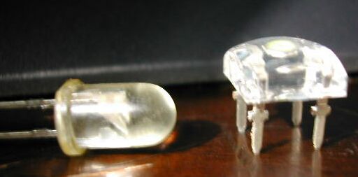 Although it is labelled as a "flashing LED" and it's the same diameter as an ordinary LED, if you look closely you can see some SMD parts and some other structures inside the epoxy dome. I don't see an exposed IC; it actually appears the flasher circuit is three seperate ICs, each one mounted inside a tiny ceramic block, and each with an LED die mounted to its top. It is also possible that the IC is a larger device and is mounted underneath the visible components. In any case, this very interesting component is actually a complete, microminiature PCB with flasher circuit and three LED chips, all encased in a discrete, LED-like ceramic & epoxy package.