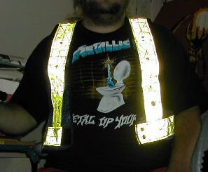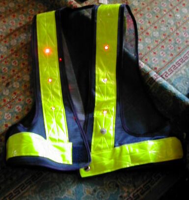 The ETG Safety Vest is a safety vest with flashing LEDs in it. You wear it as you would a regular safety vest; it has reflective stripes on each side (front and back); it also has 7 bright red flashing LEDs on each side, which you can turn on and off with a rubbery pushbutton located on the lower left front of the vest, just above the battery pocket.