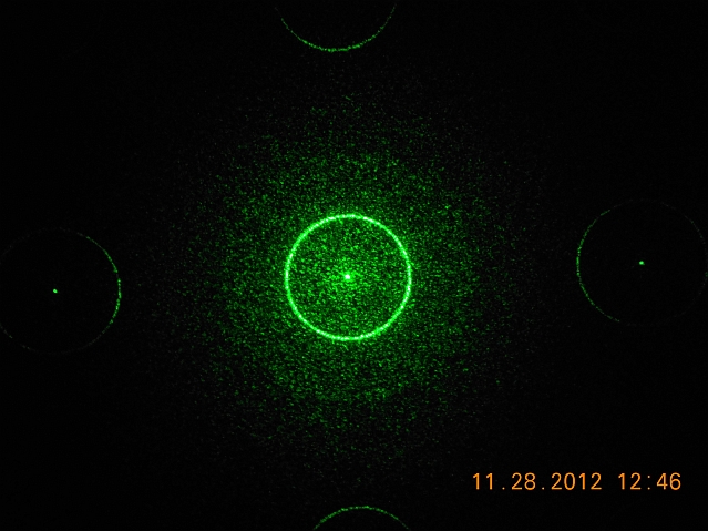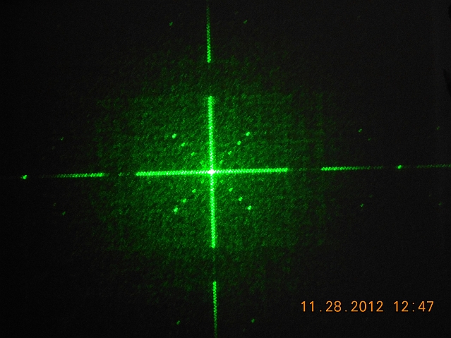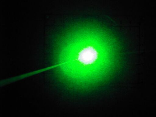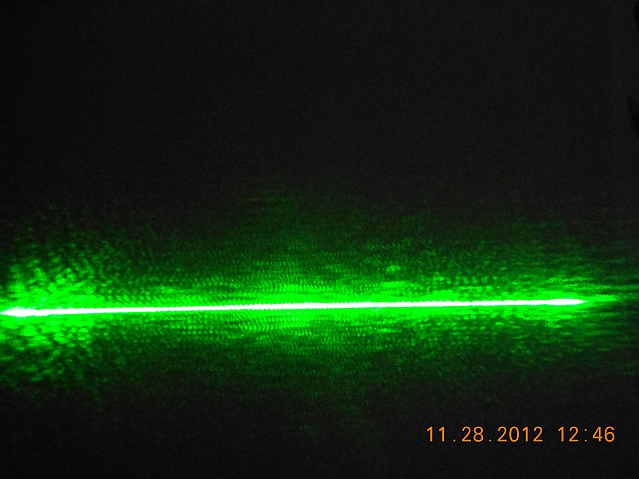 Beam photograph of the laser's beam terminus (no diffraction grating used at all) on a wall at ~140 cm.