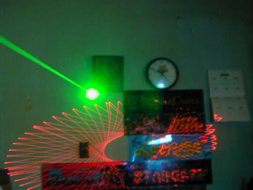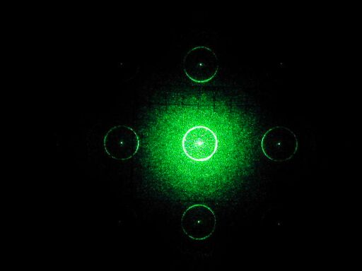 This is a green DPSS (diode pumped solid state) portable laser. It comes in a handsome brushed aluminum case, and includes the two AAA cells it feeds from. It also includes something I have not seen with green lasers before: four holographic projection heads that turn the laser dot into a right-pointing arrow, a cross, a circle with a dot in its center, and a straight line.
