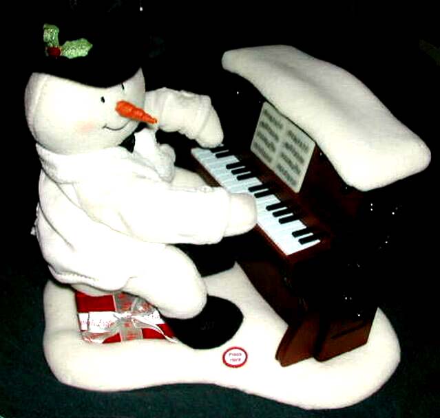 It plays verses from "Let It Snow, Let It Snow, Let It Snow", "Jingle Bell Rock", and "A Holly Jolly Christmas"; while the snowman sitting at the piano dances about and Chrismas lights on the front of and on the right side of the piano flash in time with the music.