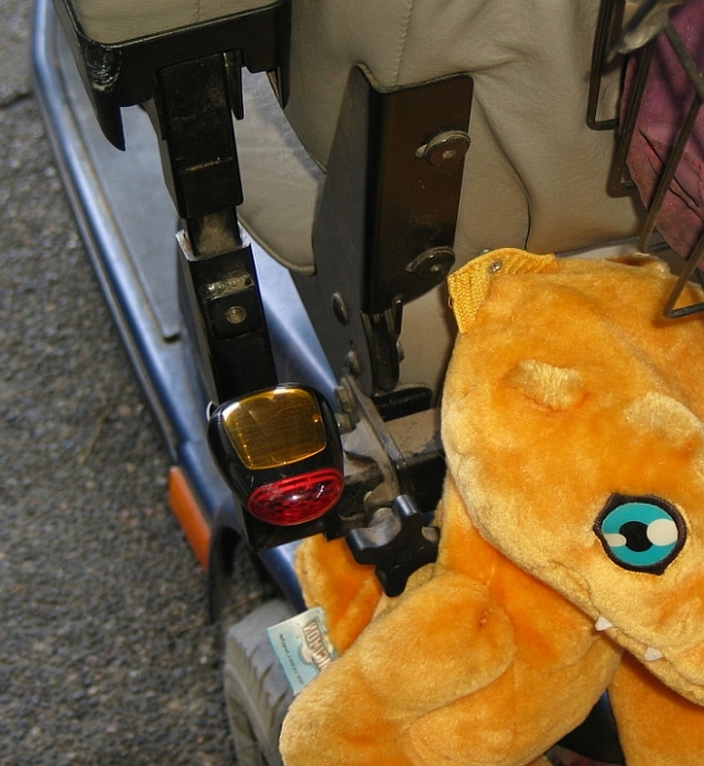 And here is a photograph showing the light mounted on the left-side seat armrest pylon on my wheelchair -- this time it is facing rearward like it is intended to be used.