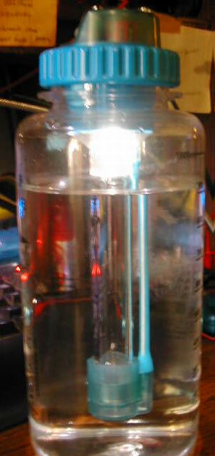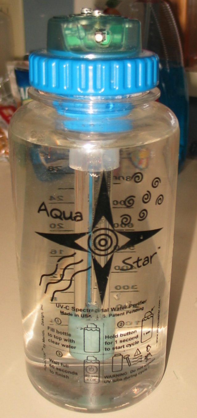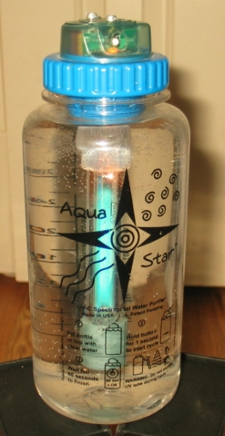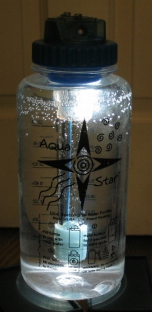 This is the AquaStar™ Plus, a 1 liter water bottle with a UV purifier and a bright white LED lantern built right in. It has a special UVC (ultraviolet C) fluorescent tube that uses UVC radiation at 253.7nm to sterilise the contents of the water in the bottle, and a bright white LED (a Nichia NSPW500CS) inside the bottle to use as a camping lantern.