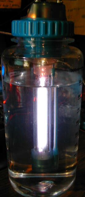 The fluorescent tube emits UVC radiation at 253.7nm; this radiation is quite dangerous to skin and eyes. Under no circumstances should you operate the bottle's core without the bottle in place!!! The bottle does shield you from 100% of this invisible radiation, so you need not be concerned about viewing the tube when it is on WHEN IT IS IN THE BOTTLE ONLY!!!