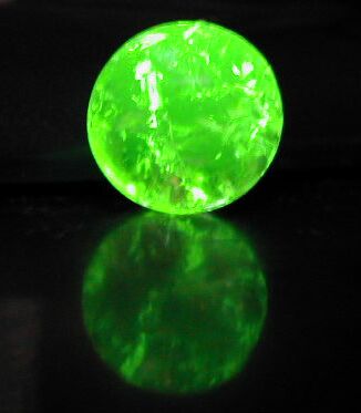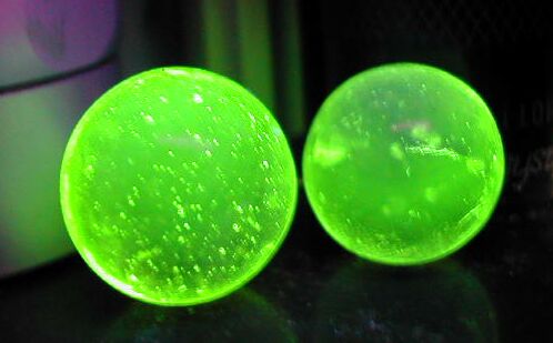 Note: These marbles appear significantly brighter in this photograph than they do in real life. They fluoresce better under longwave (UVA) radiation at about 400nm.