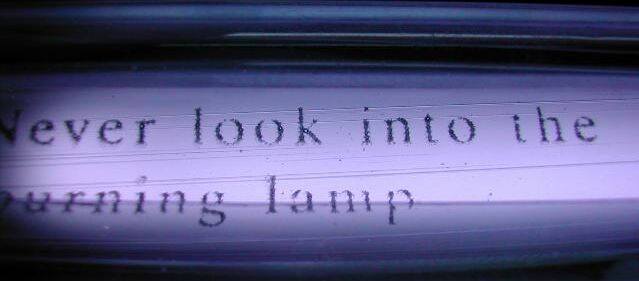 And here's a photograph, showing the warning printed on the flurorescent tube glass itself. This photograph renders the brightness much more correctly; though the color is a little too violet.