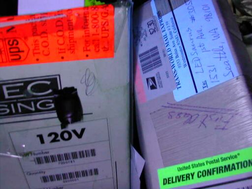 Here's a photograph of an orange UPS label and a green USPS label fluorescing under the UVC radiation from this light.