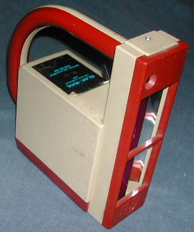 The Blak Ray contains a UVA (ultraviolet type A) fluorescent light bulb in front of a shiny reflector to produce its UV radiation peaking at 365nm, and a small screw-base incandescent light bulb (burned out in this specimen; appeared to be well-used and blackened) to produce a low level of white light.