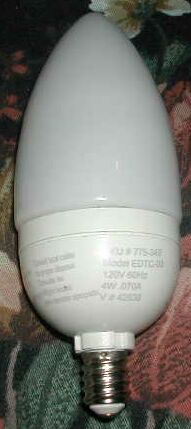 A fan of the website sent me this lamp, along with several other products. This is a candelabra base fluorescent light bulb that screws into any standard (for the United States anyway) candelabra socket, and operates directly from 110 to 130 volts AC 60Hz electrical power. It is labelled to use 4 watts, and consumes 70mA.